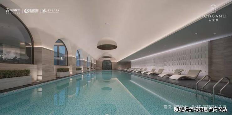 整个泳池天花板,呈现出海派拱形元素,落地玻璃窗外,是下沉式的景观空间: