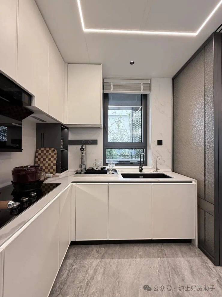 进门可以看到经典的S墙设计,L型厨房操作台面,也是暗藏不少细节——玻璃移门采用完美系列夹丝玻璃+金属造型边框,顶部配置线性凉霸+LED嵌入式回形灯带+筒灯,灶台后侧采用大面积岩板铺设,方便清洁的同时显得厨房更加大气。