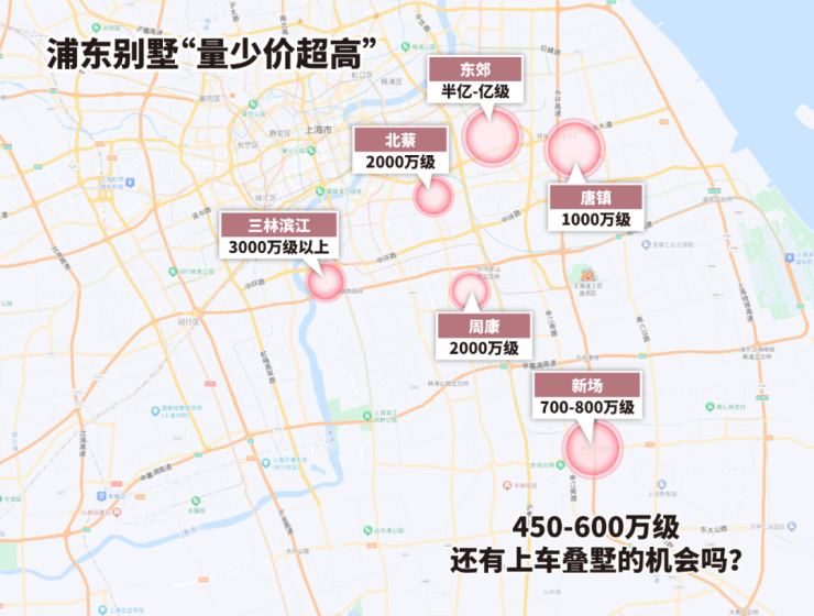 我标注了近两年浦东有别墅供应的区域,外环内基本2000万起步,唐镇1000万级,甚至你买到新场都要700-800万级。