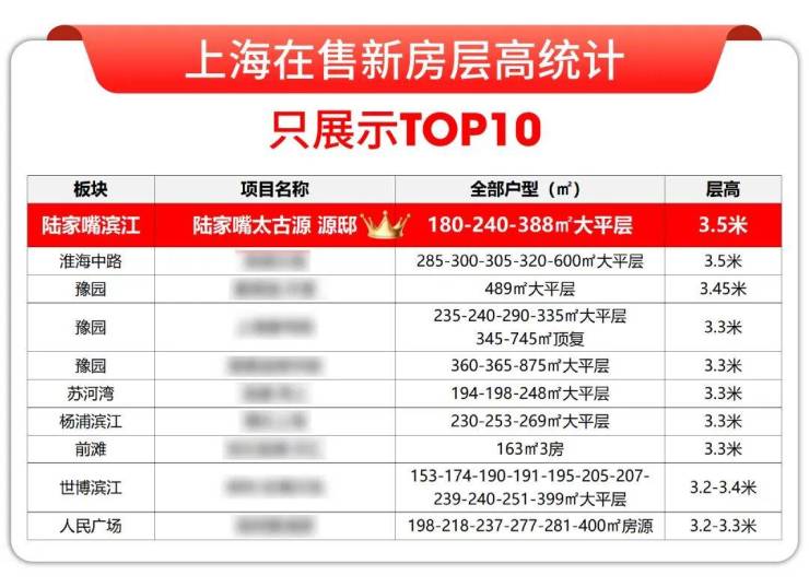 据小胖君统计,市面顶豪项目层高普遍在3.3-3.4米,而层高能达3.5米及以上的只有两三个,陆家嘴太古源 源邸就是其中之一。