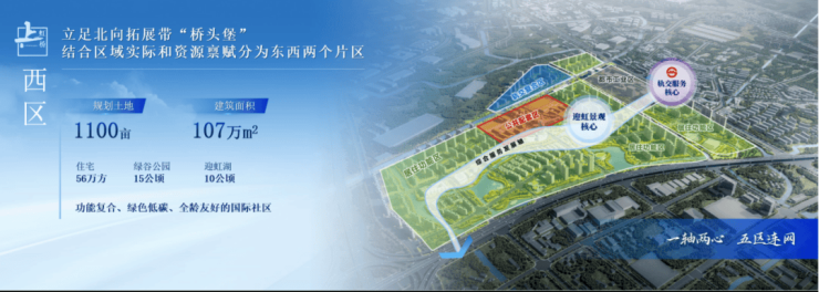 上虹桥依托东西两个片区(西居东产,共计约167公顷),遵循“以人为本、产城融合、多元包容、活力共享”的理念,整体打造创新经济集聚区、中央商务配套区和高品质国际化社区。