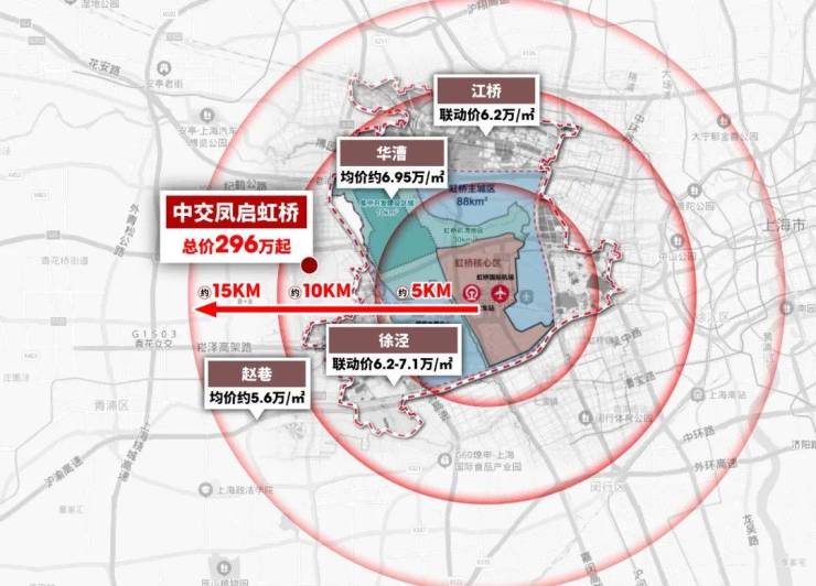 而以虹桥为中心,周边15km为半径,区域内所有的新房均价都超越5万+。
