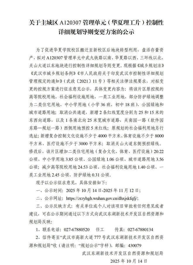 近日,市规划和自然资源局发布《关于主城区A120307管理单元(华夏理工片)控制性详细规划导则变更方案的公示》
