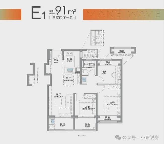 而招商·时代潮派|东屿此次建面约91㎡户型,就做出来了比市面百平户型更好的的 “南向双阳台+南北双飘窗”设计。