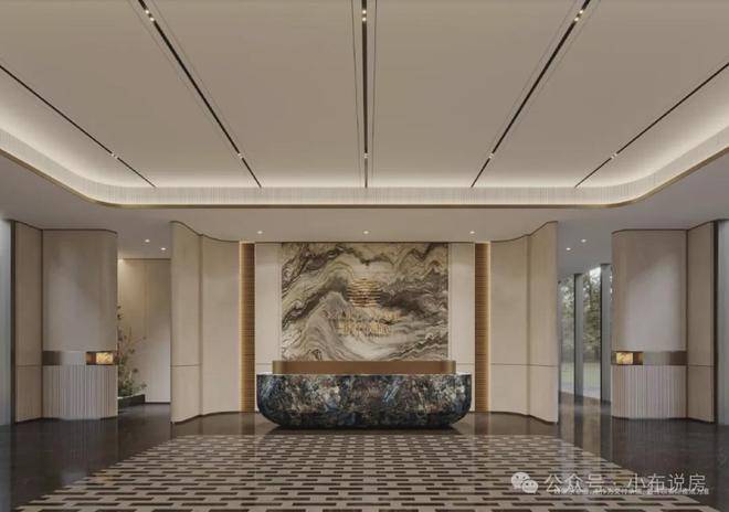 顶部香槟金造型的异型铝板精致典雅,搭配手工打磨的璀璨星空顶,仿若将银河纳入社区;地面仿石砖沉稳大气,与墙面汲取华尔道夫酒店精髓的浅米系大理石贴面相得益彰,营造出优雅静谧的氛围。