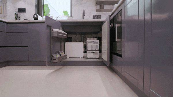 此外,通过手机APP可远程控制烤箱预热、冰箱调温及烟机动态风量调节,实现智能便捷操作。收纳系统依托博洛尼整体橱柜,利用转角空间、钻石台面及下拉式拉篮等设计,配合可按压开柜、反光镜等巧思,大幅提升空间利用率与取物便利性。厨房装修采用E0级环保板材与抗菌岩板,从源头杜绝污染,确保耐用易清洁。