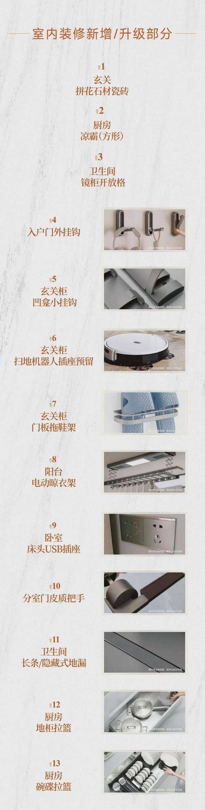 更有霍尼韦尔(或同等档次品牌)的新风、方太(或同等档次品牌)的油烟机和洗碗机、科勒(或同等档次品牌)的龙头和台盆、百年约克、圣象、施耐德等(或同等档次品牌)其他品牌国际一线品牌为生活保驾护航。