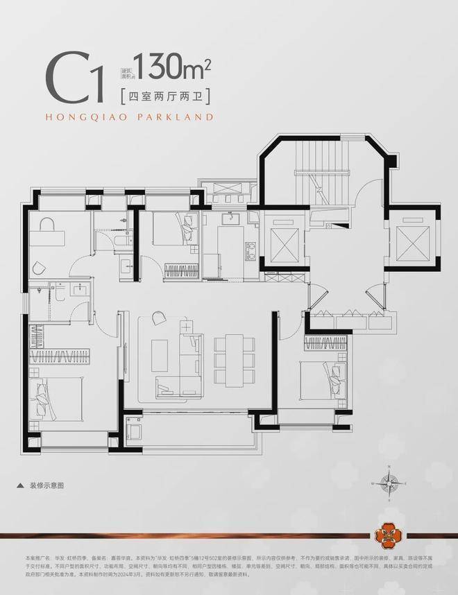 C1建面约130㎡大户型设计,整个做到了南北通透、客餐厨真正的一体化。