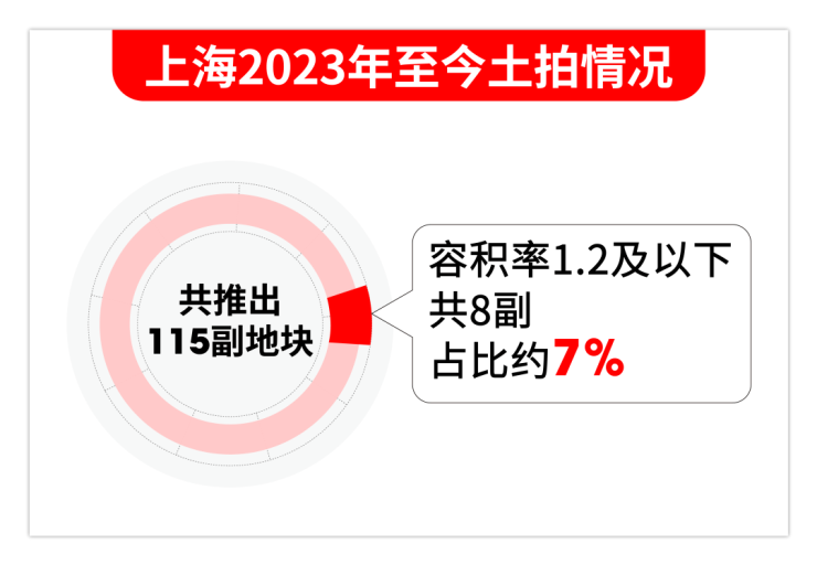 据小胖君统计,上海2023年至今,上海土地市场合计推出115副宅地,仅有8副容积率1.2及以下地块,占比约7%。