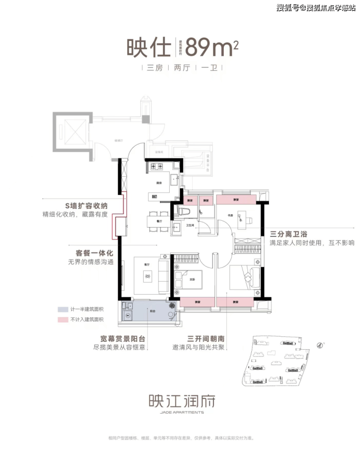 亮点一:不足90m²做三房,完美平衡舒适度,该户型很好的兼顾了功能性与总价段,让更多希望改善居住品质的人,可以实现在城区买到华润置地的品质好房,而且户型设计整体方正通透,三开间朝南,良好的采光效果,很好的关照了居住舒适度。🔥华润映江润府售楼处电话:400-8787-740👈🔥