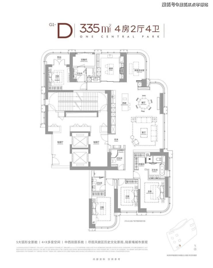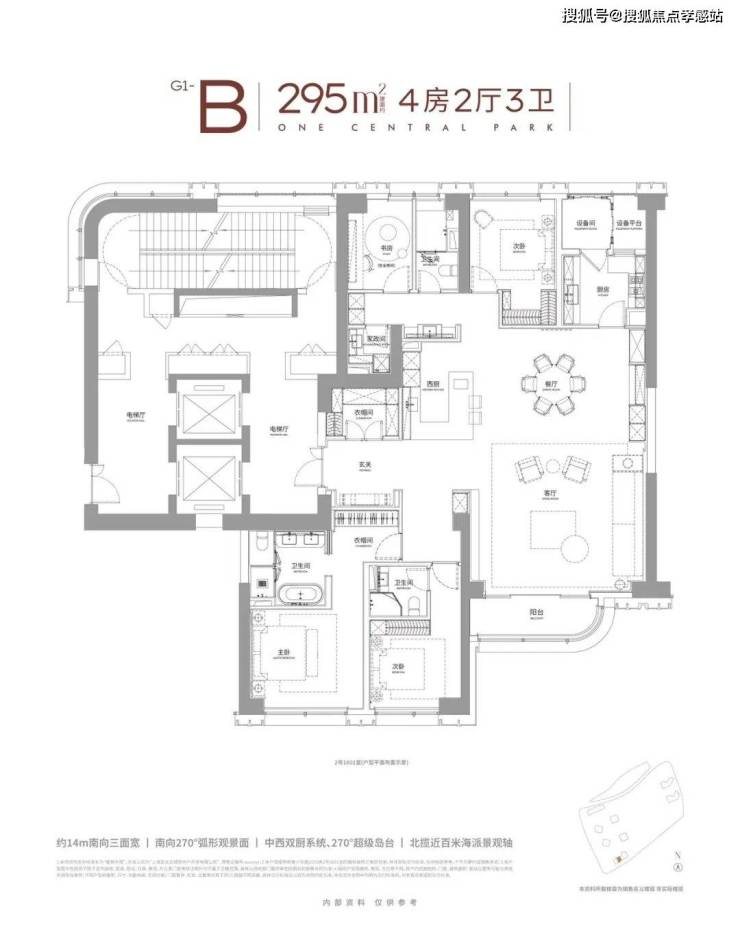 整个户型有几个重点跟大家拎一下:户型实现了全落地窗环绕、大横厅结构、270°弧形窗,极致的通透感、绝佳视野与豪宅空间所需的独立性、全景仓视野被发挥的淋漓尽致,堪称新一代豪宅的居住体验标杆。