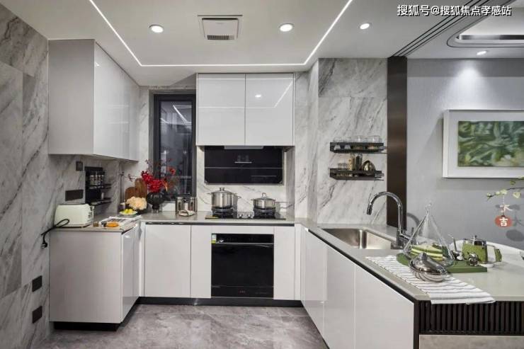 开放式厨房设计,三面环形的台面,洗涤区、烹饪区及操作台等空间划分明确。配备方太三大件,摩恩水槽、高仪龙头,即便多一个人在厨房里帮忙,也不会拥挤。方寸之间,为家人营造一方美味空间。