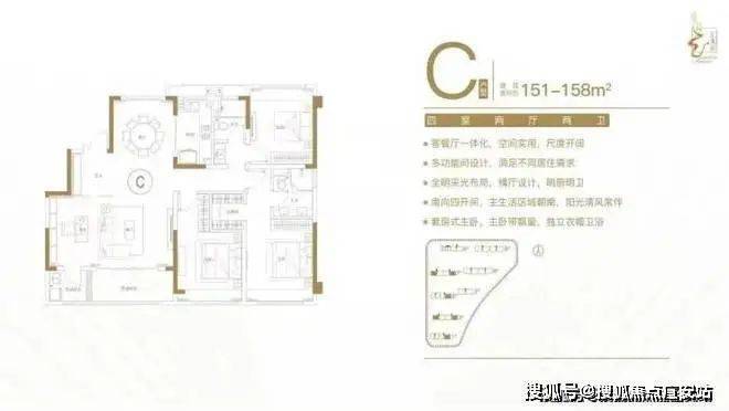 佳运汇龙府预约热线☎:400-8080-420✅✅约151-158㎡四室两厅两卫户型特点:空间灵活,满足不同家庭阶段需求;客餐厅一体化,增大实用面积;双阳台设计,全明采光,通透舒适;南向四开间,户户飘窗,采光通风性俱佳;套房式主卧,独立卫生间。