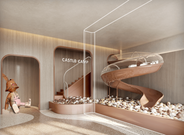 整体的归家落客尺度设计复刻了《周礼·考工记》中记录的建筑最高礼遇“面阔九间”的设计,同时,在归家酒店式落客空间,以山茶花元素为源定制了“海派漩心”艺术装置,将文化之美深入建筑的深处。