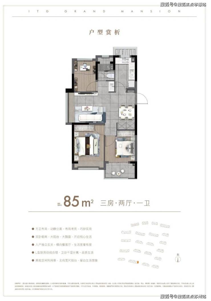 户型解析:约85㎡的3房,这种入门级的产品也要保证居住的尺度感。比如利用L形厨房与餐厅相连接,一体化的设计让空间充足利用。比如次卧连接阳台,就是人性化考虑到给他们一个私密的追光天地。