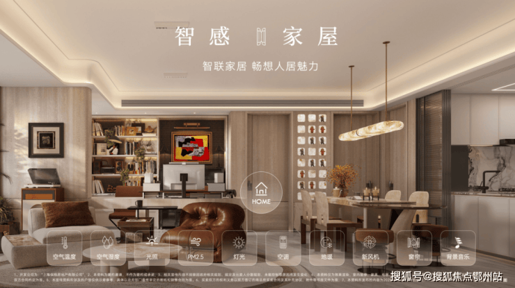 室内空间:引入了全屋智能家居系统,能通过App、中控、语音三大方式,调节全屋智能家居,包括客厅灯光、空调、地暖、新风、客厅和主卧窗帘等场景。