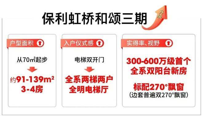②、保利虹桥和颂售楼处电话☎:400-8787-740✔✔户型再突破:户型面积段从原来70㎡起步,升级为约91-139㎡3-4房,更贴合当下家庭改善需求;全系标配双阳台;边套(除139户型)均配备双270°飘窗,中间套也有270°飘窗设计,实现「实得率+视野」双重提升。