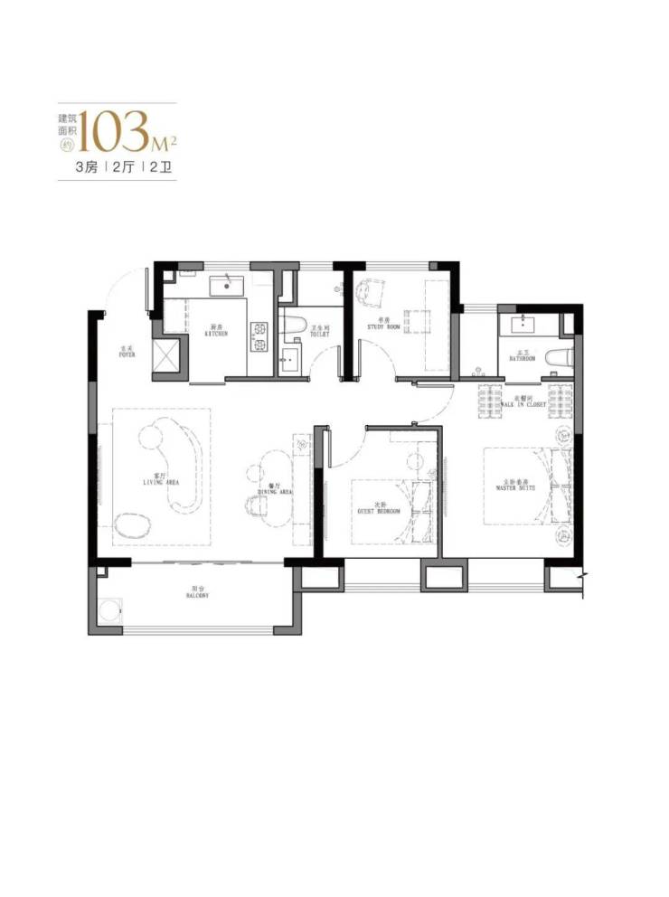 103m²户型特点:厅面宽达到5.3米,餐客厅一体。南北通透的设计,采光和通风效果好。厨房采用U型空间设计,操作方便。