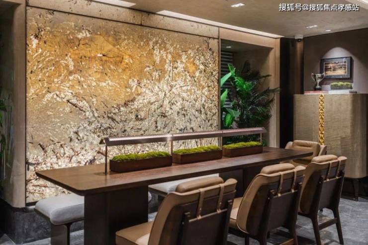 精致的迎宾水景、苍劲滴翠的罗汉松,为城市的界面,增添一抹亮色,也让当代年轻人,在享受现代都市生活的同时,感受到家的温暖和亲切。蓝翡翠的奢石,以深邃幽远的尊蓝色基底,尽显光彩下的神秘奢华;而顶部异形的仿铜星空顶设计,用香槟金色斜角造型铝板搭配熠熠灯光,碰撞出科技与艺术的美学。