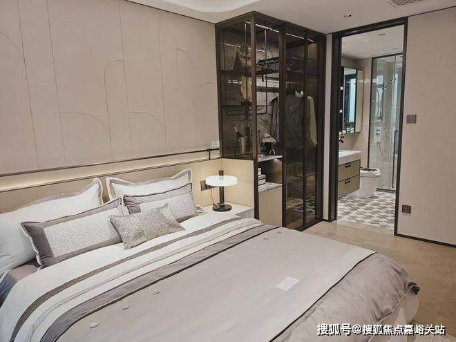 主卧套房设计,皮革造型的床背景墙也是交付标准,台盆为唯宝(或同等档次)、龙头则为科勒(或同等档次)复古龙头,马桶为高仪智能马桶(或同等档次)。