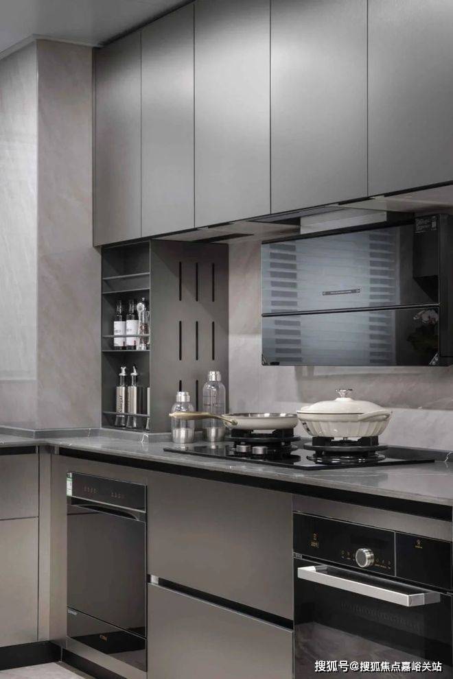客餐厅厨一体化,U型厨房设计。标配厨房七件套,包括:洗碗机+侧吸油烟机+燃气灶+蒸烤一体机、线性凉霸、末端净水、双开门冰箱!✅✅越秀杨浦天玥售楼处电话:400-8787-740✅✅连调味品收纳架也是交付的,完全可以实现拎包入住!