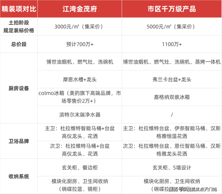 更贴心的是主卫美妆冰箱、“一镜到底”的镜柜、壁龛、厨房的“轻松抽”、餐边柜......收纳力MAX!不多拽文了,直接上对比,江湾金茂府3000元/㎡的装标实在多了👇