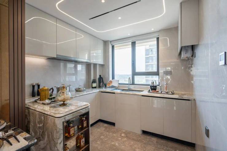 厨房融入了西厨岛台设计,从 L 型封闭厨房变为似 U 型岛台布局,扩大了台面面积,优化了烹饪动线。能容纳多人同时下厨,而且预留充足电器空间,配备隐藏式抽油机、集成灶、 集成式洗碗机,水池下有净水器,天花板上装着凉霸,让烹饪成为一种享受。
