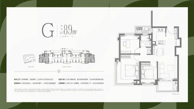 建面约89m²三房两厅一卫户型,LDKB一体化设计,南向三开间布局,全明空间设计。让四季流转于生活之中,用自然营造生活的惬意。