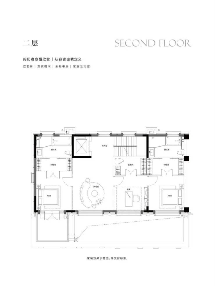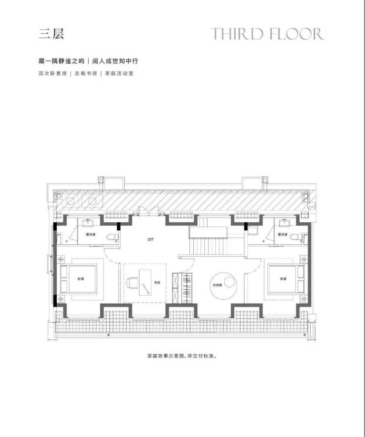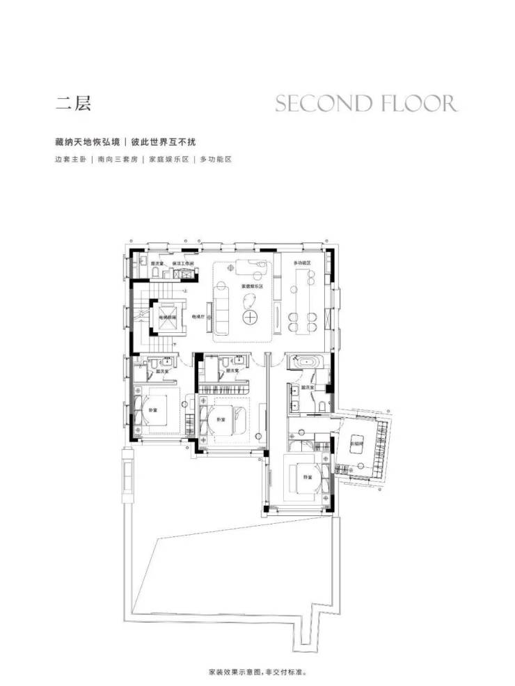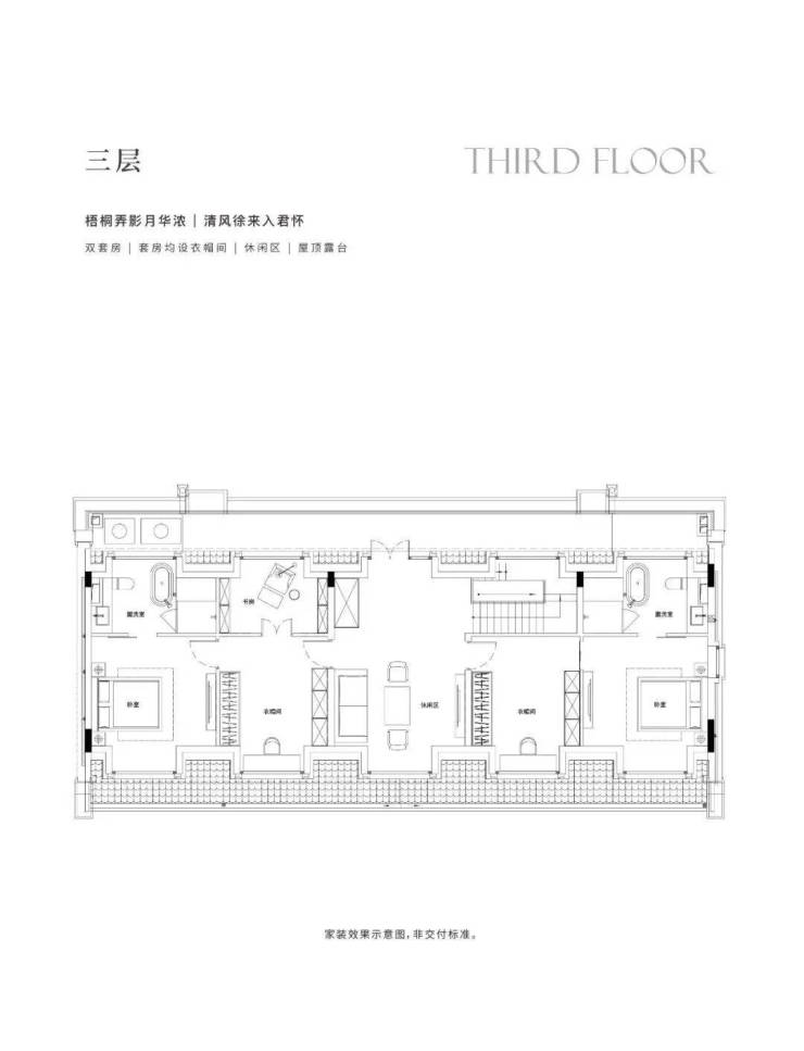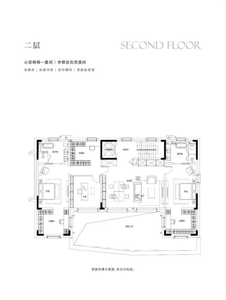 地下1F志趣空间,约7.2m层高,私人菁英社交圈层。首层花园入户,大横厅会晤场域,与时代精神际会。二三层静谧于心,起居室多套房设计,梧桐下的栖心之所。屋顶露台、花园庭院,超大附赠面积,藏身心于天地恢弘。