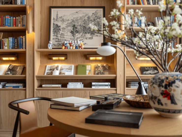 多功能书架彰显着设计的巧思,形成有如博物馆般的展示方式,即可放置日常读物,亦可展示珍本藏书。同时,利用屏风做隔断,与圆桌结合形成私密空间。