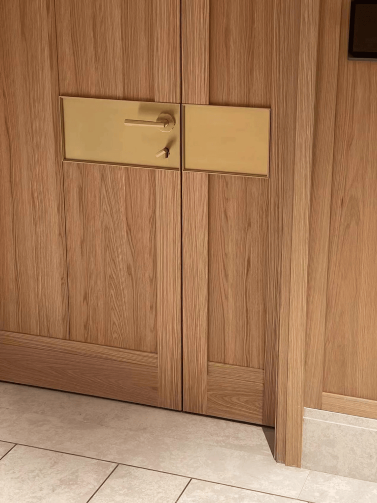 黄铜门锁系统,是门厅中无法掠过的视觉焦点,它极具质感,与空间的美学特征统一。Design333特别请了Von Morris创始人Eric Morris一同探讨样板间与整个项目所需要的门把手设计,经过了对饰面、手感、形制的多轮讨论与打样,研发出了一款天潼198项目限定的门把手。