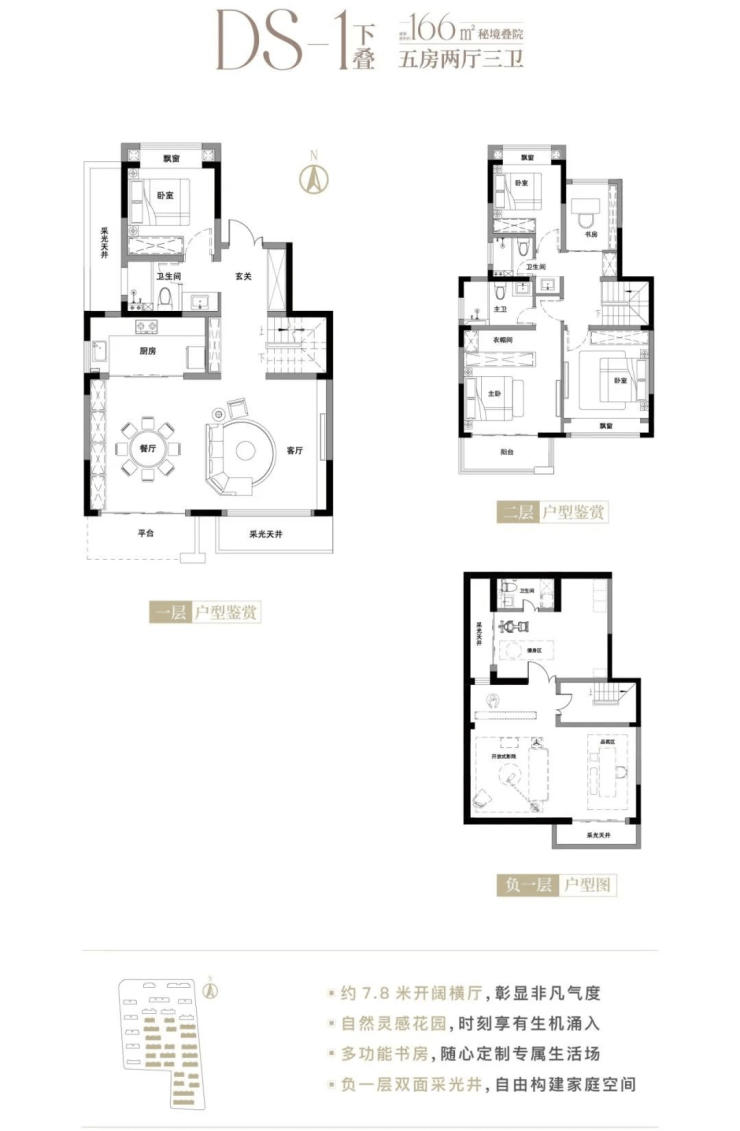 关注户型设计,约166平五房下叠,一层为餐客厅搭配老人房,二层为三卧室+书房,功能区分错落有序;
