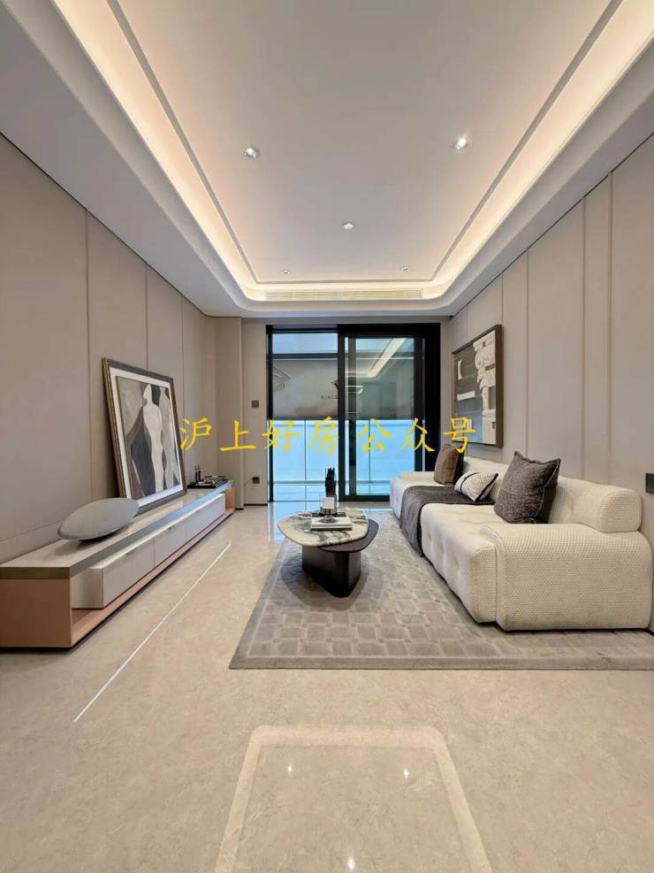 电视背景墙采用卡慕白的石材+皮革造型,弧形吊顶,相当讲究,连空调出风口的形状都打造为海上·清和玺logo山茶花的形状~~三大件为大金(或同等档次)中央空调和地暖,新风系统为百朗(或同等档次),南向阔景阳台,采光视野一级棒!
