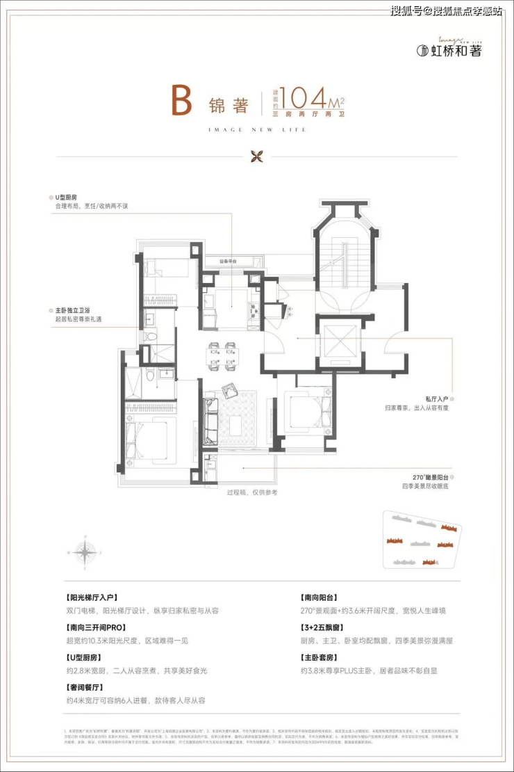 建面约104㎡3房,在建面94㎡小3房优点上,又进一步升级了尺度感,约10.3m的南向面宽,为室内带来了出众的采光面和尺度感,这个户型无论从实用性、尺度感,亦或是视野、采光、私密性来说,都做得相当优秀。