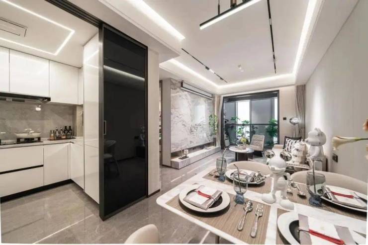 厨房空间,甄选 西门子新款的抽油烟机、灶具、洗碗机等,甚至连大部分项目不配备的冰箱也是交付标准;还特别 配置了轨道插座、前端净水器和凉霸;吊轨金属玻璃移门,既美观又方便清理。