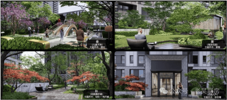 多花园:沿归家轴线设计了悠闲童梦花园·、静谧私语花园、精致乐享花园、邻里会客花园、活力健身花园等。花园种植了像金桂、红梅、晚樱、榔榆等植被,常绿与落叶植物组合搭配,三季有花,四季有景。