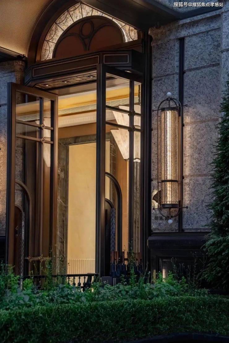 而在上层,则采用了上海海鸥丽晶酒店同款立面石材——巴西金;大门的门扇部位以高超的陶瓷镶嵌铜丝工艺,配纯手工掐丝珐琅贴片的精制拼贴。