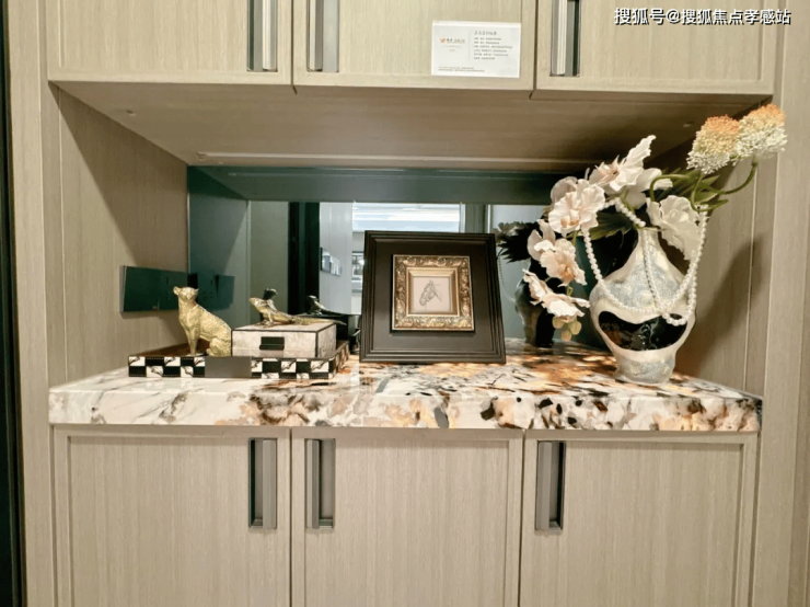 玄关处的柜台面,「越秀杨浦天玥」售楼处电话:400-885-5420✨✨精选了产自巴西的雪山飞狐奢石。该奢石因其非凡的美感与卓越品质,深受青睐,常用于高端家居及商业空间的装饰。雪山飞狐奢石所呈现的黑白相间的纹理以及其中均匀散布的水晶颗粒,为周遭环境赋予了别具一格的美学意蕴。