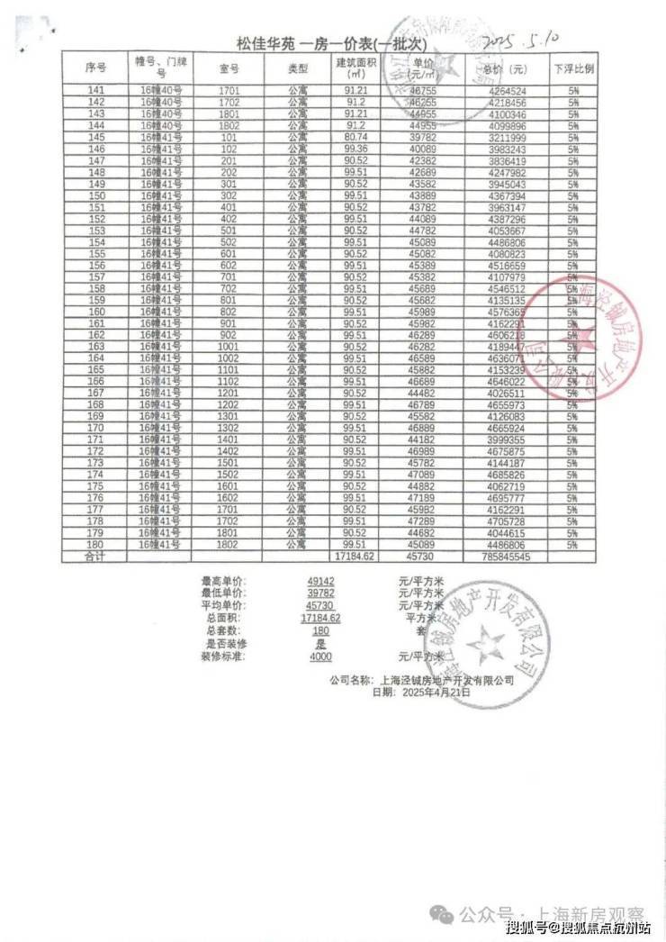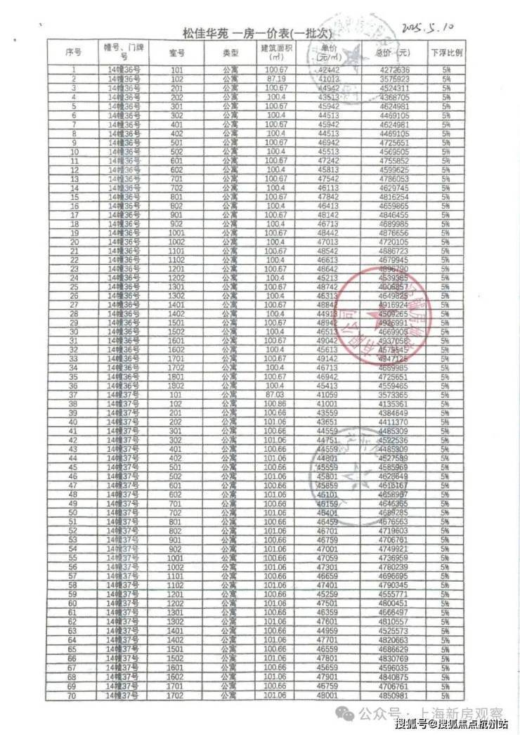 上期一房一价表如下