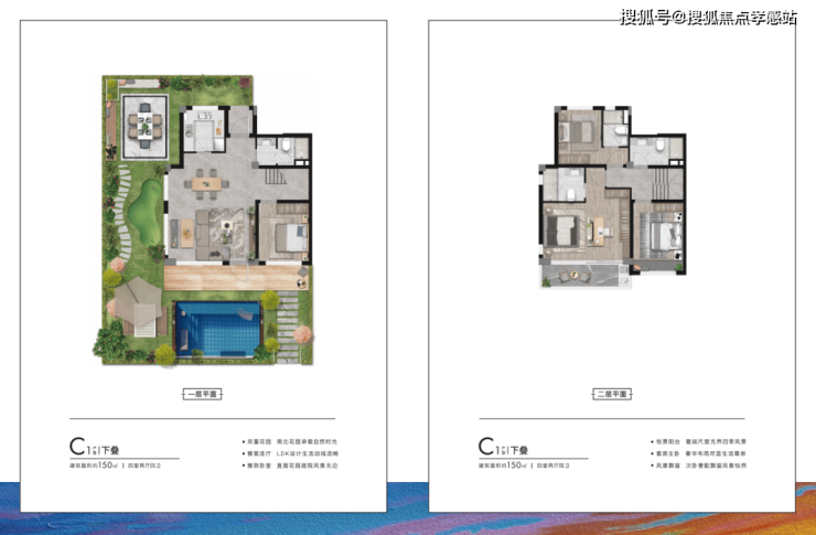 来看户型,面积段有两种——建面约95㎡下叠、上叠;建面约150㎡下叠、上叠。