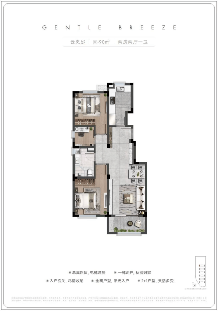 建筑采用新中式风格,黛瓦白墙配以简洁线条,内部以“坊、弄”空间布局还原江南里弄文化。合院别墅采用L型布局,地上三层地下一层,附带40-60㎡私家庭院及5.2米挑高地下室,得房率超200%;电梯洋房总高四层,一梯两户设计,南北通透全明格局。项目邻近轨道交通崇明线陈家镇站(在建),预计通车后5站可至金桥,10站抵达陆家嘴,轻松融入上海主城生活圈。对口上海思南路幼儿园崇明分园及上海市实验学校附属东滩学校(九年一贯制)。3公里内覆盖金茂凯悦酒店、由由喜来登酒店等五星级配套,满足高端消费需求。建面约80-90㎡洋房: