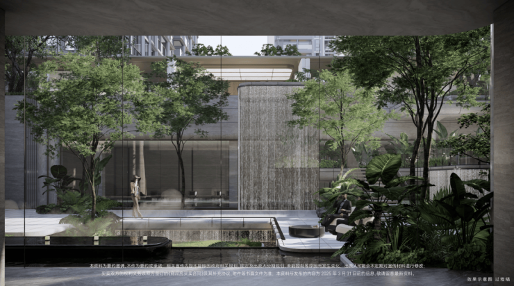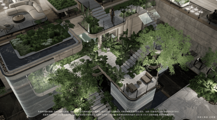下沉式庭院,通过垂直景墙、悬浮观景台与叠水景观的立体交织,实现移步换景的视觉效果,也与会所空间形成无界交互。