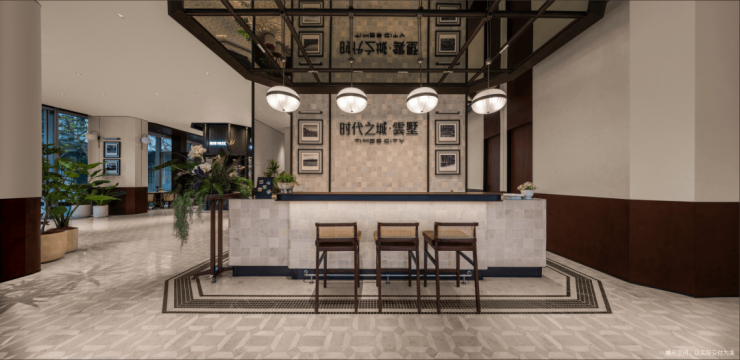 约200平左右的归家大堂做了书吧、落客区、咖啡吧,颇有现代摩登风格的感觉。