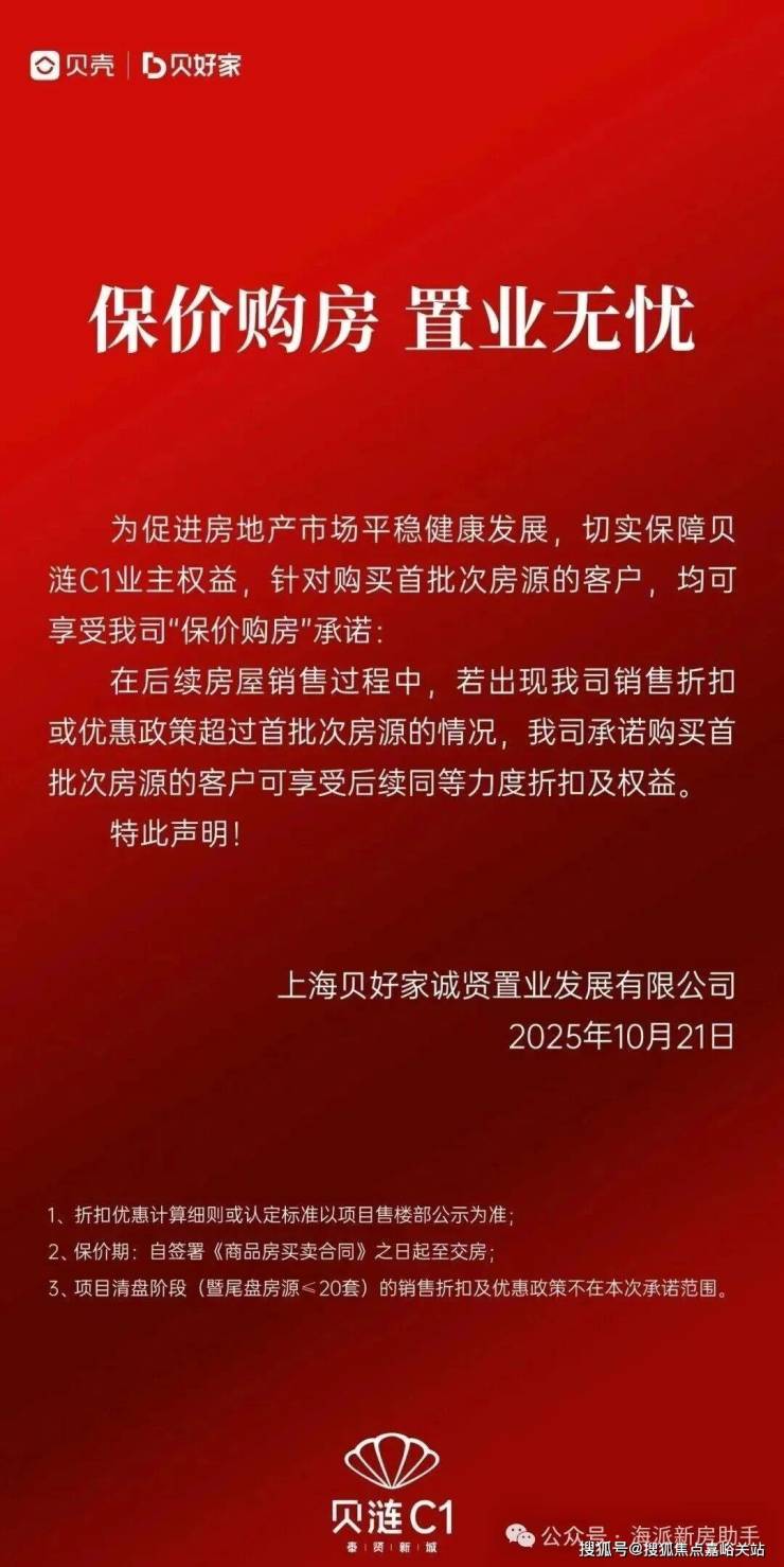 10月21日,贝壳旗下贝好家在上海的首个项目“贝涟C1”发布公告,推出“保价购房”承诺:凡购买首批房源的客户,若后期出现更大力度的销售折扣或优惠,可同步享受同等级别的权益补差。