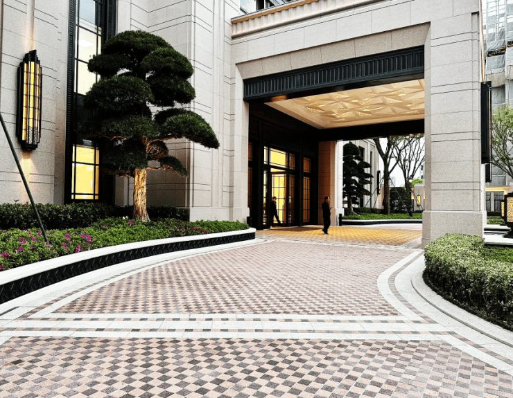来看项目外立面,红色的面砖加底部葡萄牙沉香米黄石材,经久不衰,且属于越看越好看的类型。