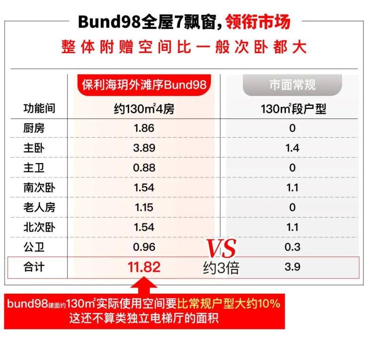 相比常规户型只是全卧飘窗布置,Bund98户型不仅厨房带飘窗,主卧和两个卫生间更带双侧采光的270度飘窗,总共七个飘窗,飘窗不计入建筑面积,附赠远超常规户型。