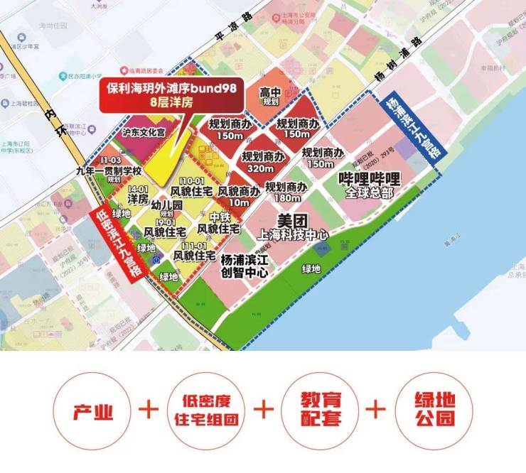 项目位于杨浦滨江红线内(以平凉路为界),占位杨浦滨江南段,12号线宁国路站轨交便捷出行,项目距离黄浦江约800米,可以步行享受杨浦滨江的休闲、文化资源。