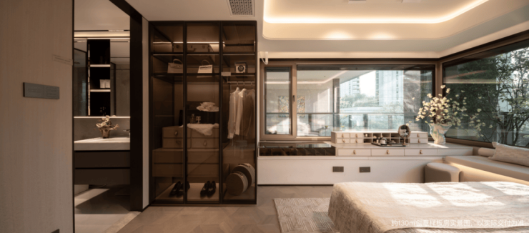 主卧则可放置600mm进深的衣柜(一般主卧多见550mm柜体),而且它能放下双衣柜;主卫镜柜分类也格外精细,让女主人收纳井井有条。