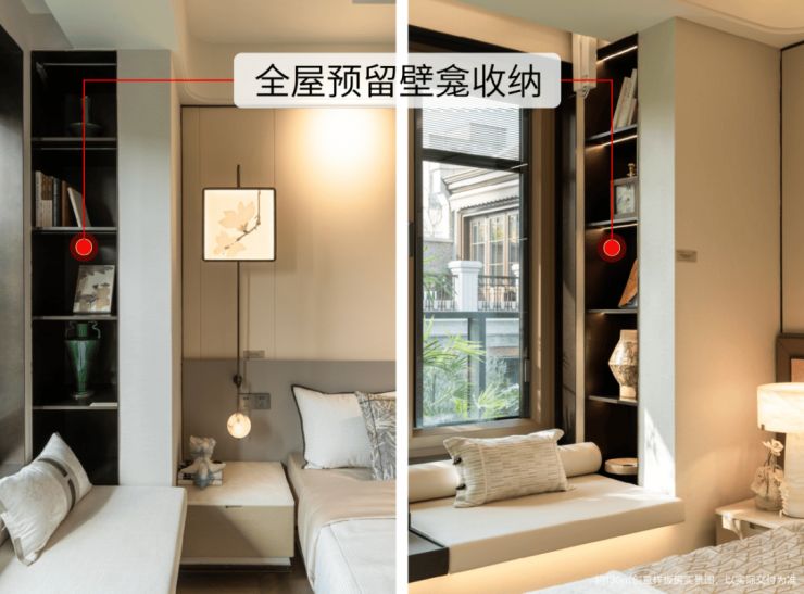 又比如,卧室预留壁龛收纳空间,后期可摆放艺术品、相册、香薰、书籍等。