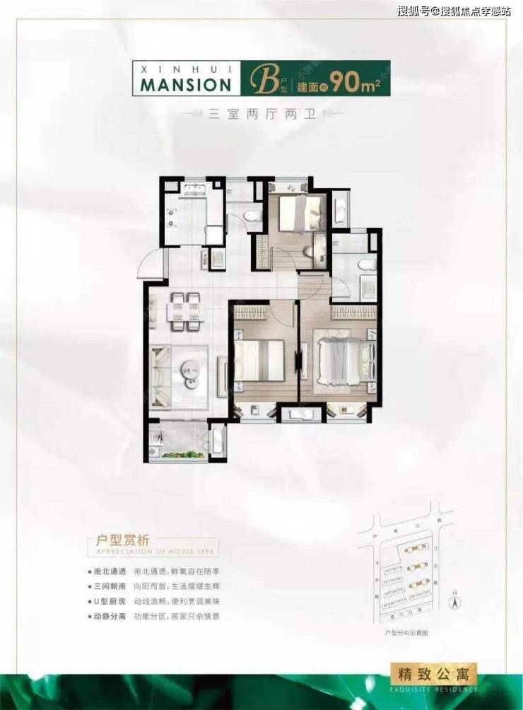 【同润·新云都会】售楼处电话✆:400-8855-420✆建面约94㎡3房2厅2卫户型特点:做到了三开间朝南+主卧套房设计+全卧飘窗+动静分离+卫生间干湿分离,功能性与空间感完美结合的3房“神户型”。